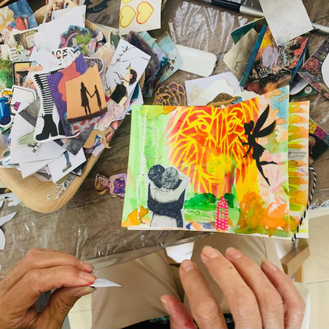 חומרים נדרשים: צבעי מים, דף מים גודל A4, מכחול שטוח ומכחול עגול, דימויים (תמונות ומילים- תקבלו ממני מתנה חוברת דימויים דיגיטלית לשימוש במהלך הסדנא ולאחריה), ניירות שונים (לדוגמא: משי\עטיפה\נייר אפייה\ עיתונים ועוד) , דבק סטיק, מספרייים, עטים, טושים ומה שיש בבית...